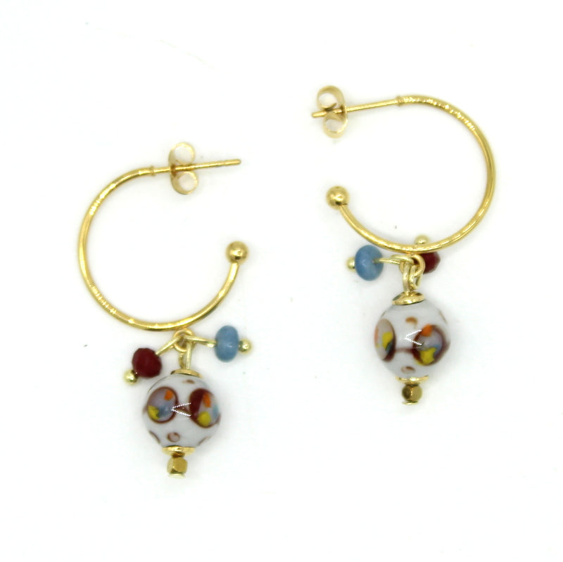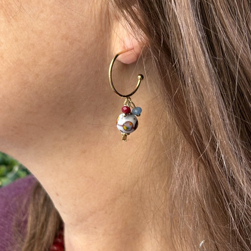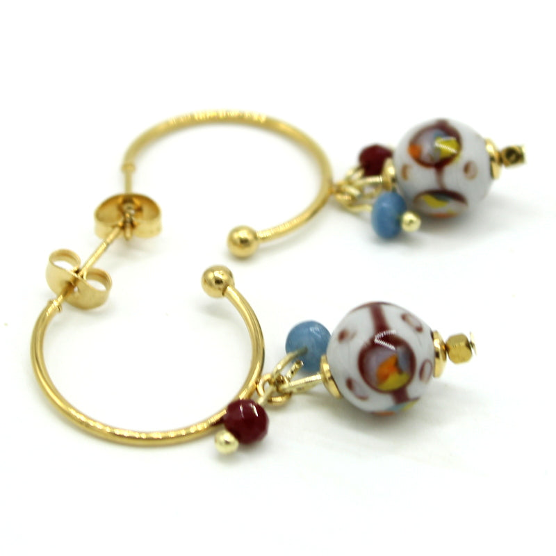 Créoles en acier doré, habillées d’une perle en verre de Murano grise, décorée de bordeaux et décor multicolore. De petites perles en verre bordeaux, agathes bleues viennent compléter cette composition élégante.