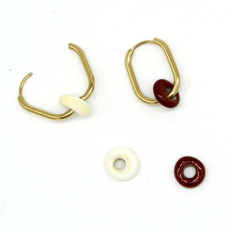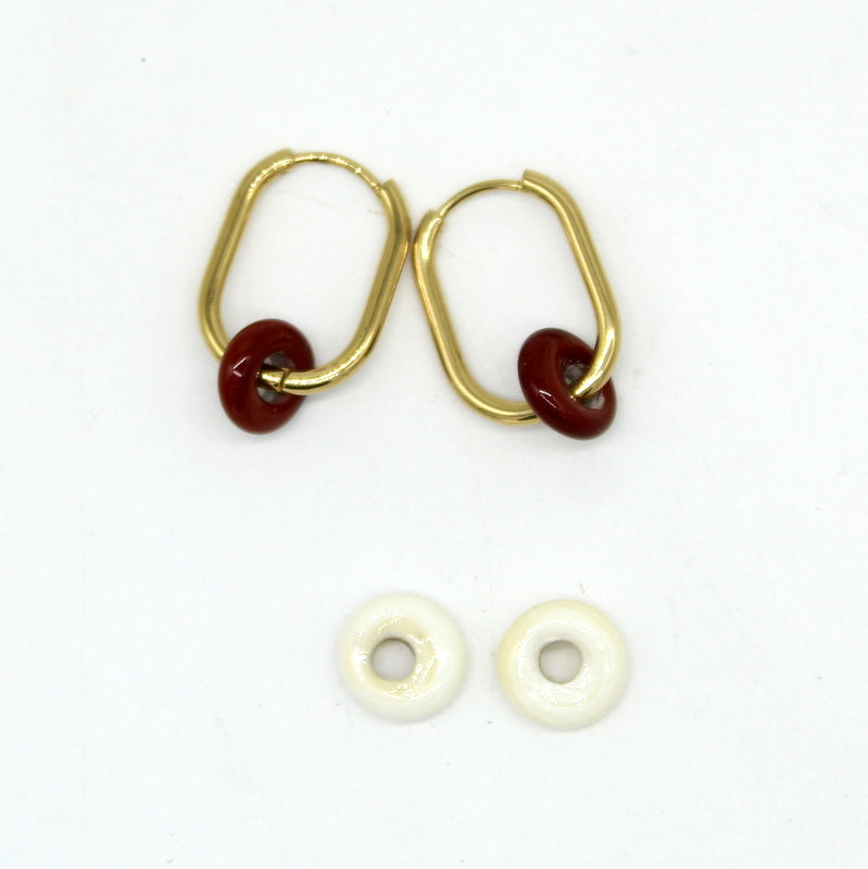 Créoles en acier doré, habillées de perles galets filées à la flamme en verre de Murano, une paire : 2 bijoux ! Perles interchangeables, teinte chocolat ou ivoire.