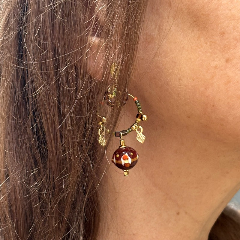 Créoles dorées rehaussées de petites pampilles dorées avec perles filées en verre de Murano marron, décor ivoire, kaki, orangé. Fermoir tige en acier.