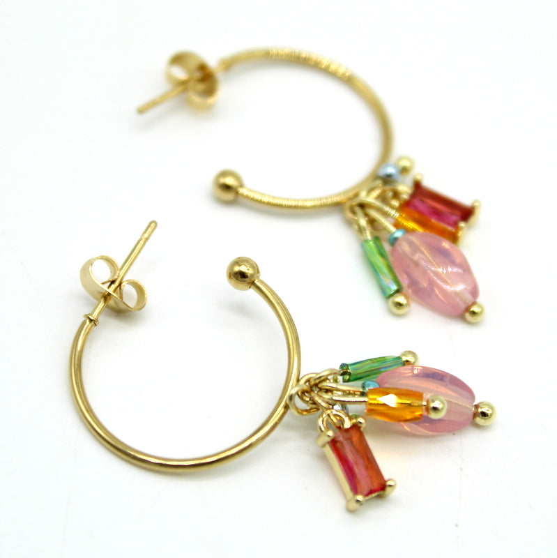 Ces boucles Yuna revisitent la créole classique. En acier doré ouvert, elles s’ornent de petites perles roses et multicolores, relevées par un cristal rose fuchsia éclatant.