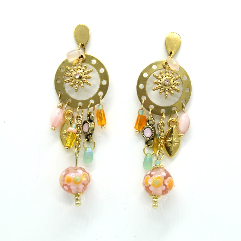 Boucles d'oreilles puce en acier doré, perle en verre de Murano rose transparent, décor rose opaque, vert pastel, autres perles en verre.
