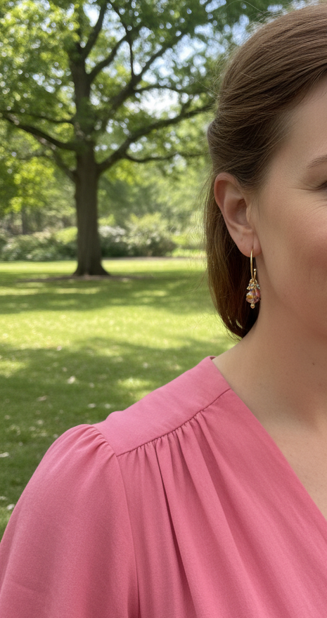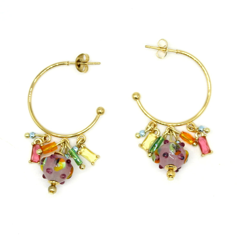 Des créoles en acier doré qui dansent à la lumière. Les boucles d’oreilles qui jouent avec le mouvement grâce à leurs pampilles délicates : perles filées en verre de Murano rose, cristaux jaune pâle et rose, et petites perles en verre bleu ciel et orange.