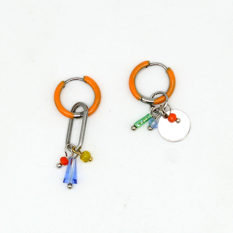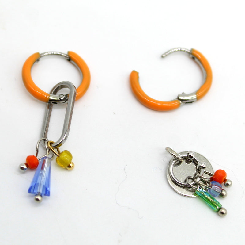 Originales ces créoles sont asymétriques, en acier émaillé orange, avec perles en verre, à porter avec ou sans pampilles.