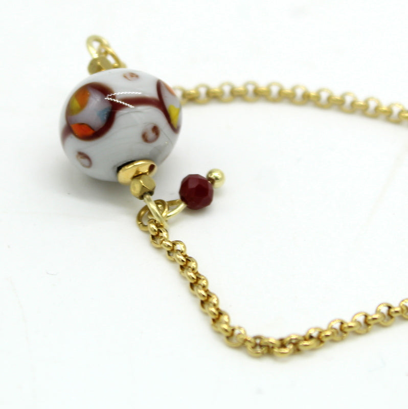 Bracelet réglable chaîne d’acier doré, grâce à une bague coulissante qui s’adaptent au poignet. Au centre, une perle en verre de Murano, gris élégant, décor bordeaux et touches multicolores. Un bijou à la fois pratique et raffiné.