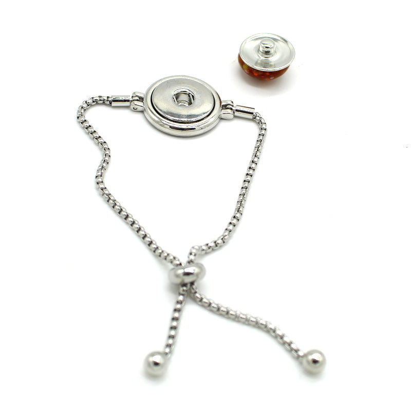 Bracelet en métal argenté, perles interchangeables grâce à son système de pression. Perles en verre Murano topaz transparent, décor moucheté multicolore.