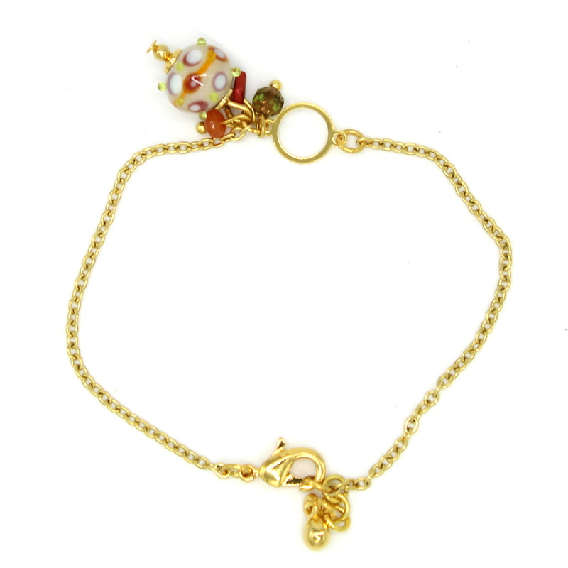 Bracelet chaine fine en acier doré, perles en verre de Murano taupe irisé décor corail, kaki, jaune soleil, brun. Autres perles en verre.Métal anti-allergène (sans nickel, sans plomb et sans cadmium).