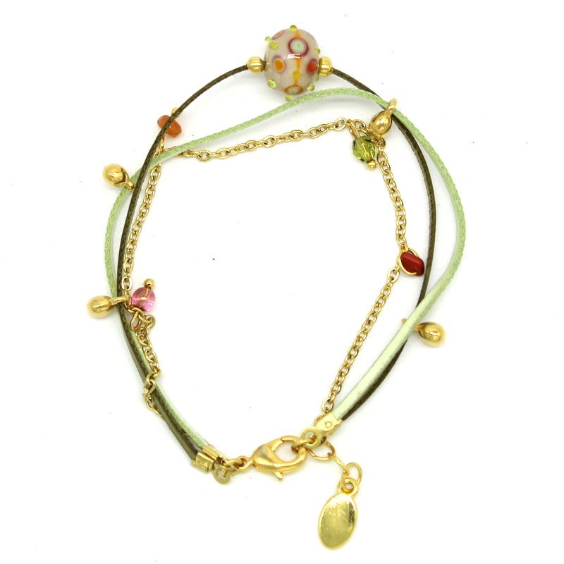 Bracelet 3 rangs chaine fine en acier doré, liens en cuir, perles en verre de Murano beige irisé, décor lilas, kaki, orange, jaune soleil, autres perles en verre.Métal anti-allergène (sans nickel, sans plomb et sans cadmium).