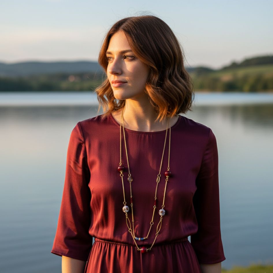 Collier long et double en acier doré, alternant perles en céramique bordeaux et perles en verre de Murano filées à la flamme, grises, animées de décor bordeaux et multicolore, apportent une touche vibrante à l’harmonie des matières. Un bijou au caractère affirmé, pensé pour jouer sur les superpositions.