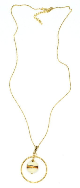 Collier long magnifique perles en forme de lentille de 25 mm en verre de Murano ivoire, décor réalisé avec des fils de verre fusionné jaune moutarde, bleu, rose, corail, marron, chaine en acier et fermoir doré à l'or fin.