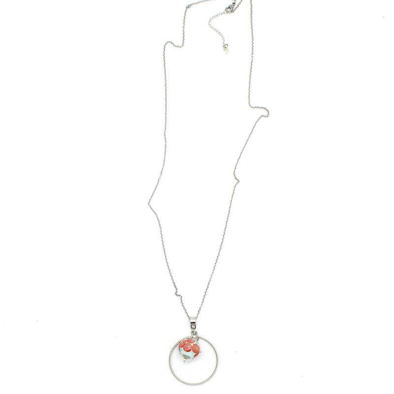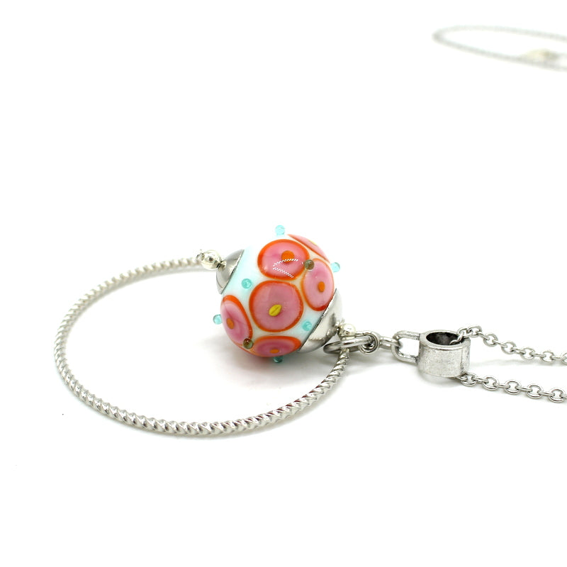 Collier long avec chaine en acier, perles en verre de Murano mint décor rose à l'or, jaune, orange.