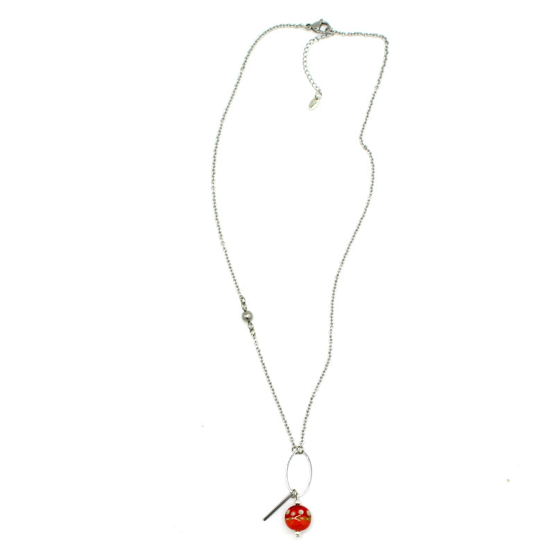 Collier chaine en acier, perles en verre de Murano rouge, décor vert d'eau.