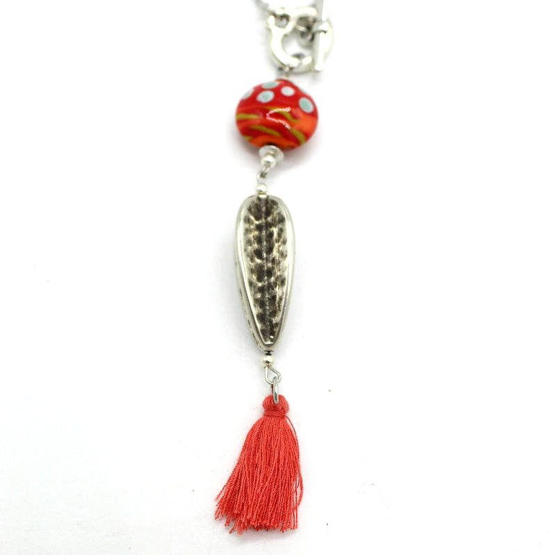 Sautoir chaine en acier, perles en verre de Murano rouge, décor vert d'eau, pompon rouge, perles navette plaqué argent.