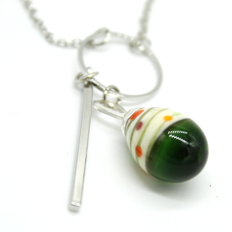 Pendentif argenté, perle en verre de Murano ivoire décor vert foncé pois multicolore.