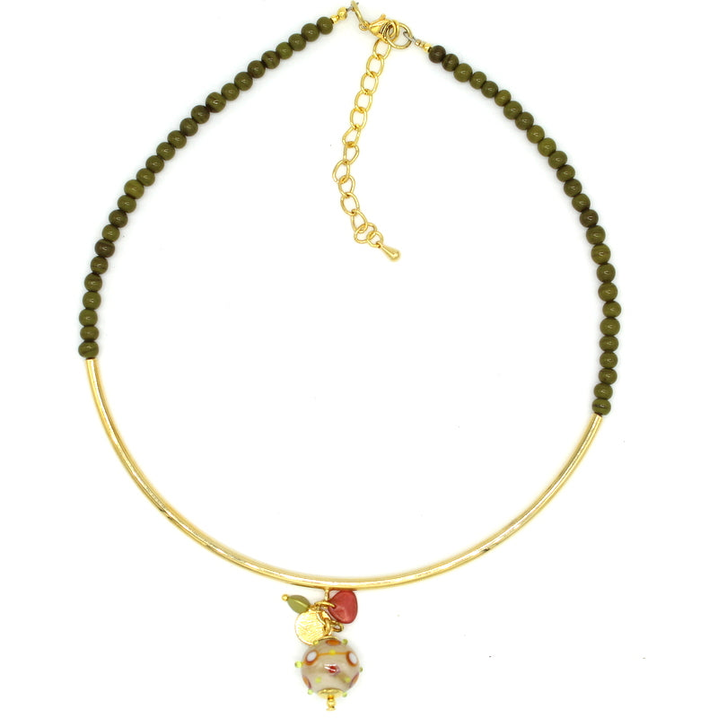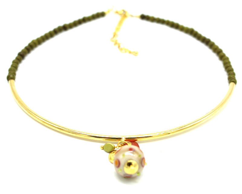 Collier ras de cou, perles en verre de Murano taupe irisé décor corail, kaki, jaune soleil, brun. Autres perles en verre.Fermoir en acier