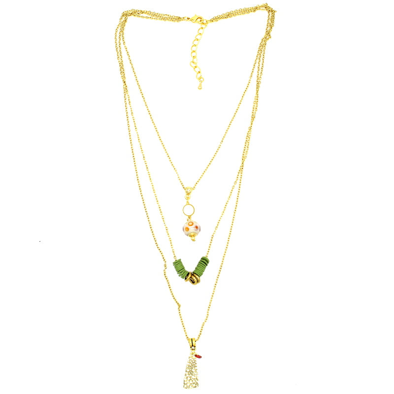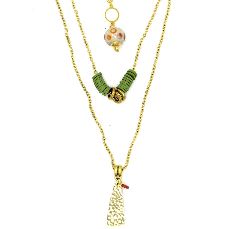 Collier longs 3 rangs, perles en verre de Murano taupe irisé décor corail, kaki, jaune soleil, brun. Autres perles en verre, et polymère kaki.Chaine acier doré, fermoir acier.