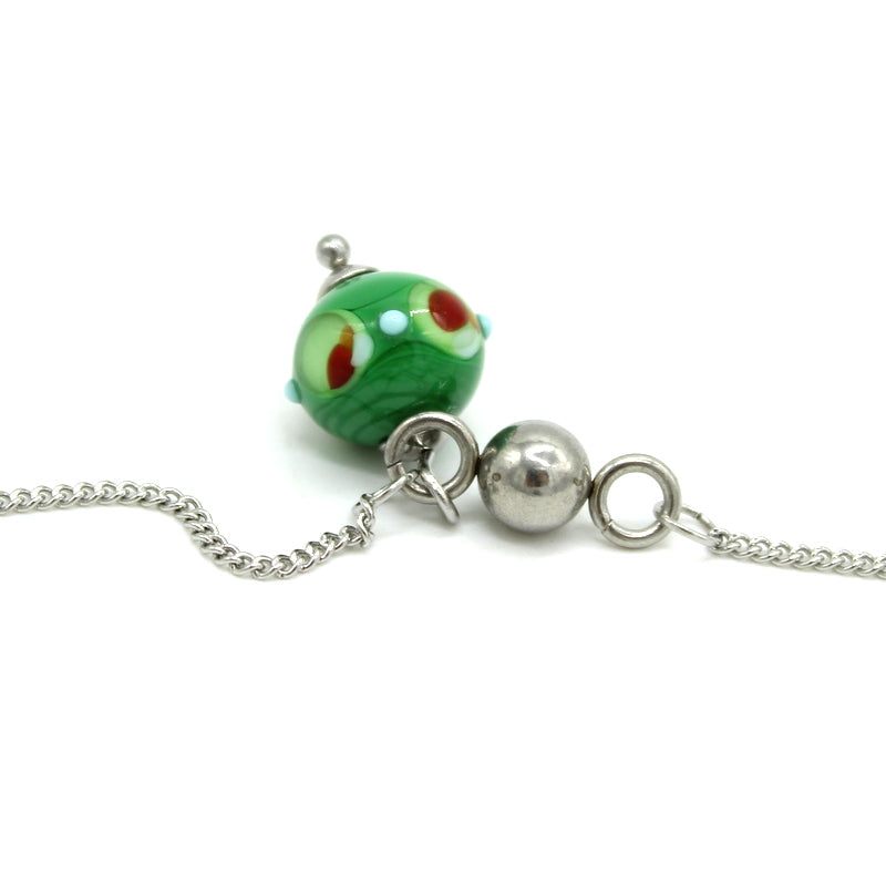 Bracelet chaine en acier, perles en verre de Murano vert décor rouge, mandarine, bleu.