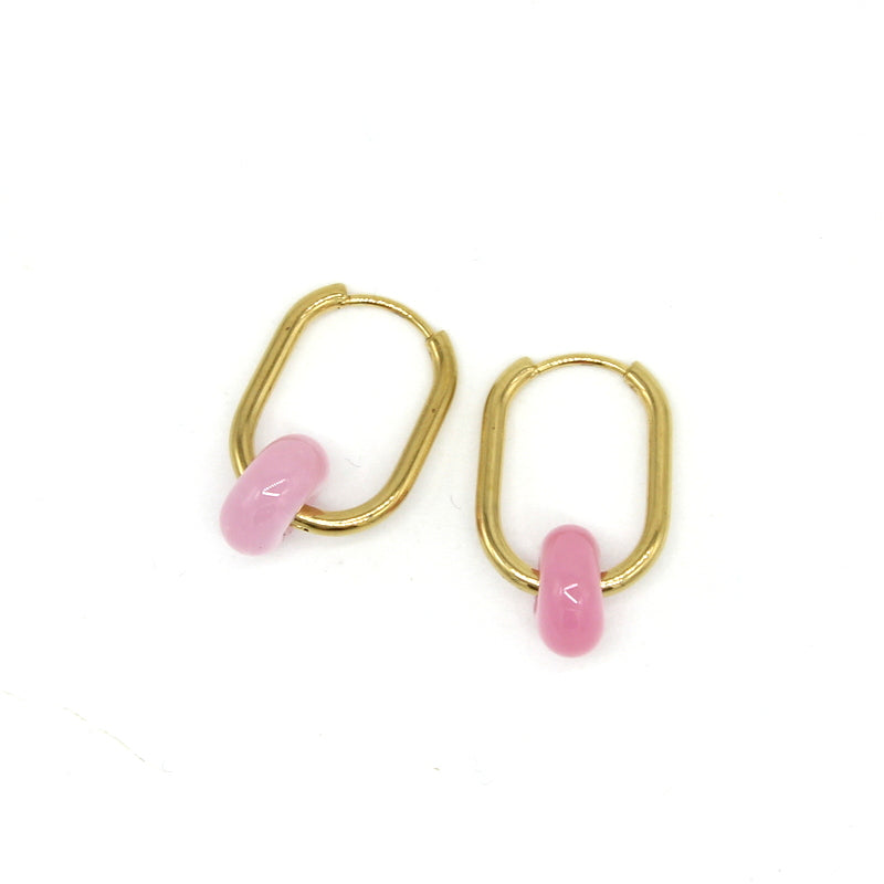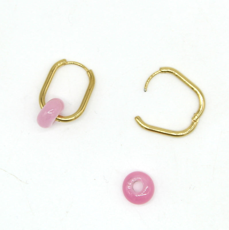 Réinventent la créole avec élégance. Leur forme ovale en acier doré accueille des perles galets roses en verre de Murano, interchangeables pour varier les styles.