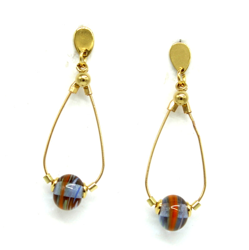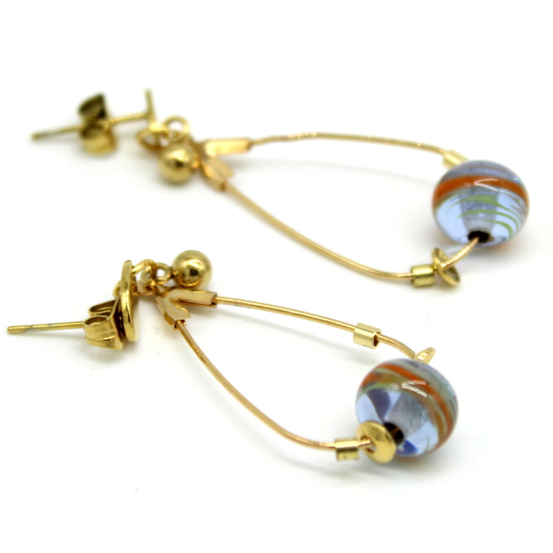 Petites créoles ovales avec d’une perle en verre de Murano bleu transparent décor multicolore, fermoir en acier.