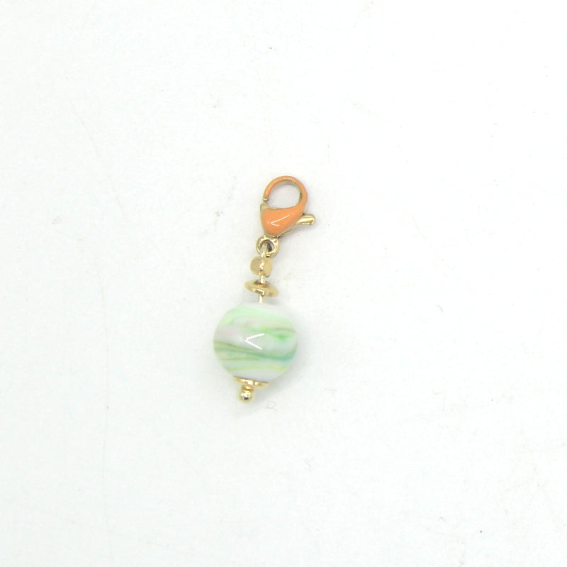 Perle en verre Murano blanc liseré bleu, anis, à accrocher à votre bracelet grâce au mousqueton en acier doré émaillé orange, composez votre combinaison au gré de vos envies ou de vos tenues.