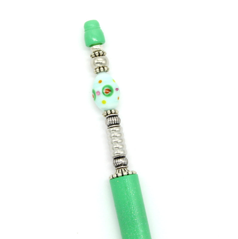 Magnifique stylo vert avec une perle en verre de Murano couleur mint décor vert, rose.